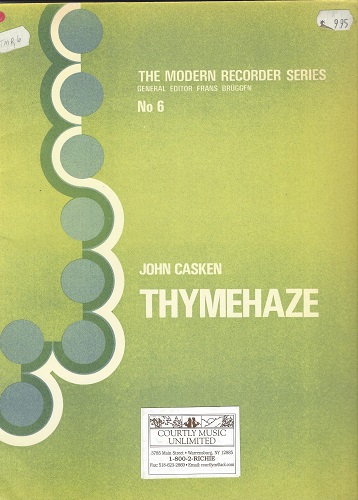 THAYMEHAZE, 1979 composed by 20th-century English composer John Casken. It was composed for the English recorderist Alan Davis and was published as #6 of 'The Modern Recorder Series' general editor, Franx Bruggen. The work requires contemporary techniques, free meter (no time signatures. It is for ALTO RECORDER and Piano. The playing level is Advanced. Photo |